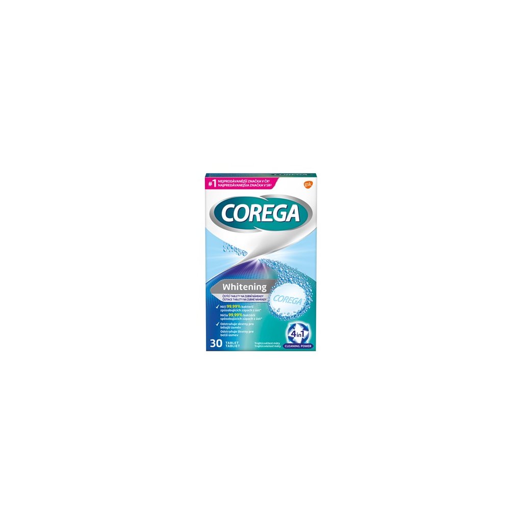 Corega Tabs Whitening čistící tablety na zubní náhrady. Zubní náhrady jsou přibližně 10x měkčí než lidský chrup a jejich čištění běžnou zubní pastou způsobuje rýhy, v kterých se mohou množit bakterie. Čistící tablety Corega Whitening pomáhají čistit zubní náhradu šetrnějším způsobem než bežná zubní pasta. Ničí až 99,9% bakterií způsobujících zápach z úst a pomáhají odstranit plak a odolné skvrny. Při doporučeném používání pomáhají zachovávat původní barvu vaší zubní náhrady. Vhodné také pro namáčení vyjímatelných ortopedických aparátů.