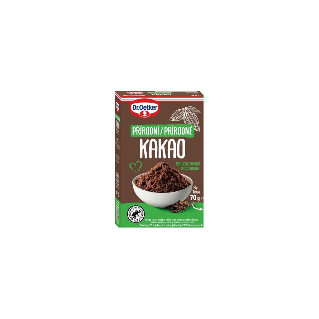 - Přírodní kakao Dr. Oetker je 100 % kakao s jedinečnou přirozenou plnou kakaovou chutí a vůní. Zachovává si důležité vlastnosti kakaových bobů, neboť neprošlo alkalizačním procesem. Je proto bohaté zejména na velmi ceněné antioxidanty. Přírodní kakao má světlejší barvu než kakao holandské a nižší pH. Díky této vlastnosti je velmi žádané např. do receptů na pečení s použitím jedlé sody. Přírodní kakao je nejoblíbenější v Severní Americe. Dopřejte si jedinečné 100 % Přírodní kakao Dr. Oetker všude tam, kde vám záleží na výsledné chuti a kvalitě.