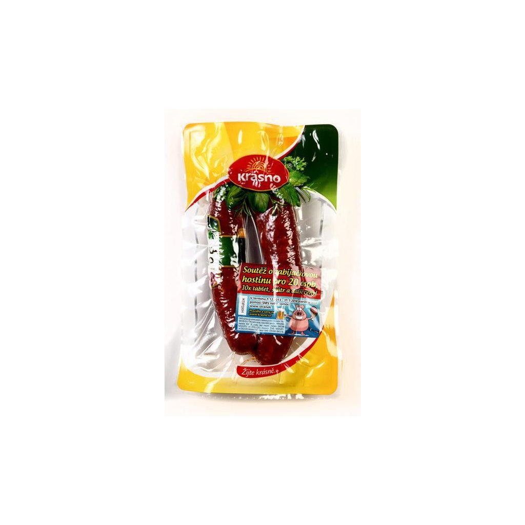 Vepřové maso, Vepřové sádlo, Jedlá sůl, Vepřová bílkovina, Sušená zelenina (česnek), Dextróza, Koření, Extrakty koření, Kvasničný extrakt, Startovací kultura mikroorganismů, Konzervant - E250, Na 100g výrobku bylo použito 129g masa