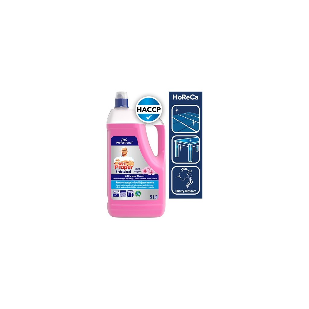 Univerzální profesionální čisticí prostředek Mr. Proper Professional na podlahy a omyvatelné povrchy. Může být použitý ředěný i neředěný. V případě použití zředěného produktu není potřeba další oplachování. Perfektně čistí a odstraňuje nečistoty i mastnotu a s odolnou špínou bojuje až o 40 % rychleji. Zanechává dlouhotrvající lesk a svěží, příjemnou vůni třešňového květu.