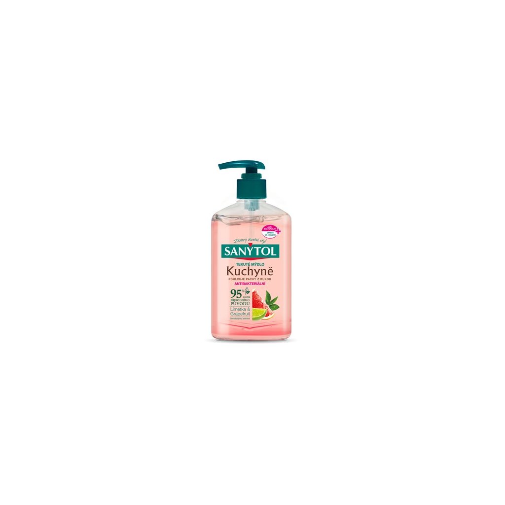 Většina infekčních chorob se přenáší prostřednictvím rukou, proto je jejich pravidelné mytí tím nejjednodušším způsobem, jak infekcím předcházet. Dezinfekční mýdlo SANYTOL do kuchyně obsahuje 95 % složek přírodního původu s výtažky z limetky a grepu. Ty odstraňují pronikavé kuchyňské pachy (česnek, cibule, ryby…) a zanechávají tak ruce svěží, hebké a bez nepříjemného zápachu.“ Zničí 99,9 % bakterií, candida albicans, virus chřipky H1N1, E. coli, salmonely, listérie, herpes viru, zlatého stafylokoka a lidského koronaviru 229E), Bez chlóru, Ideální pro pohlcování odolného pachu: z česneku, cibule, ryb...., Dermatologicky testováno., Zanechá ruce čisté, jemné, hydratované a příjemně voňavé. Použití: Naneste malé množství mýdla na vlhké ruce, vytvořte pěnu. Roztírejte na prsty, dlaně, hřbety rukou i nehty po dobu 1 minuty. Opláchněte čistou vodou. Velikost: 250 ml