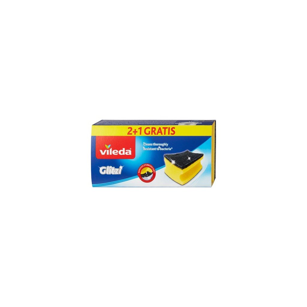 Okrajový design mycí houby Vileda Glitzi podporuje lepší úchop a tím efektivnější práci. Zároveň chrání nehty a konečky prstů. Extra čistící krystaly na silném drhnoucím povrchu urychlují a zefektivňují mytí.